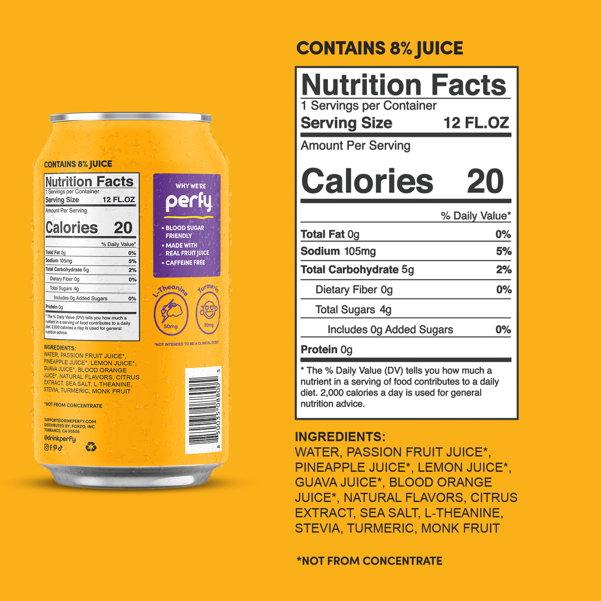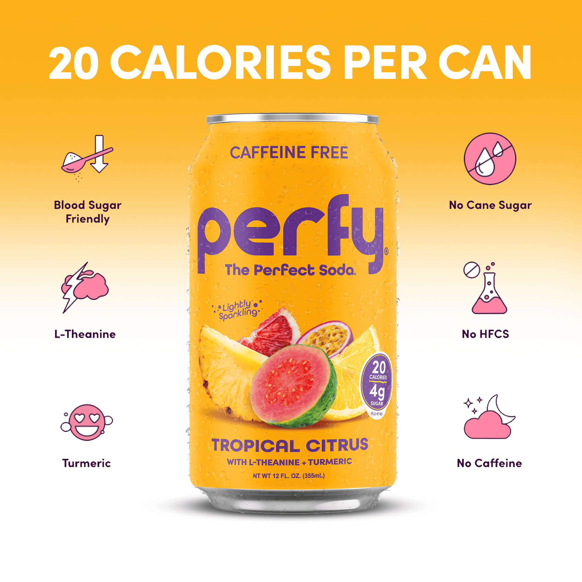 Each can of Tropical Citrus has 4g sugar, 20 calories and is enhanced with 50mg of L-Theanine and 30mg of Turmeric.